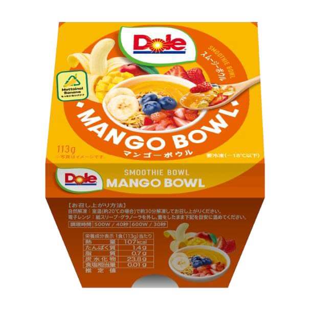 『Doleスムージーボウル』は、スムージーベースにバナナ、ブルーベリー、ストロベリー等の冷凍フルーツ3種をカップに盛り付けた、オフィスやご家庭などで手軽に人気のスムージーボウルを楽しめる一品です。フレーバーは『Doleスムージーボウル アサイー』、『Doleスムージーボウル マンゴー』の2種類。