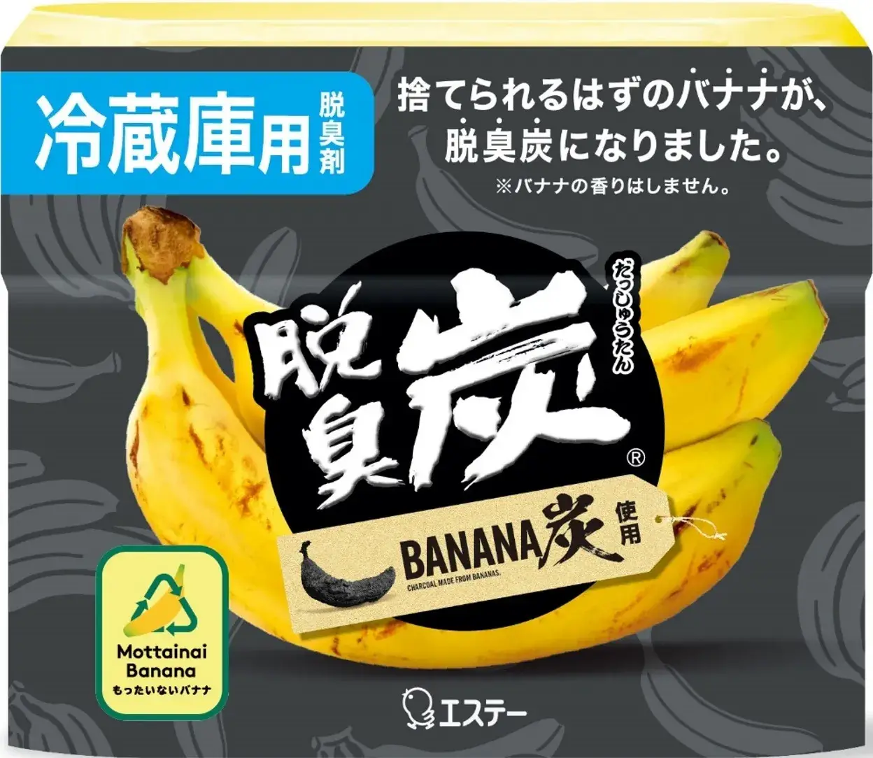 『脱臭炭 冷蔵庫用 バナナ炭』はエステーが開発・販売する、『バナナ炭』と活性炭を配合した脱臭剤です。同社の処方技術で、2種類の炭を配合したゼリーが悪臭をしっかり脱臭。処方配合にも工夫がこらされ、従来品の「脱臭炭 冷蔵庫用」と同様の脱臭効果を発揮します。