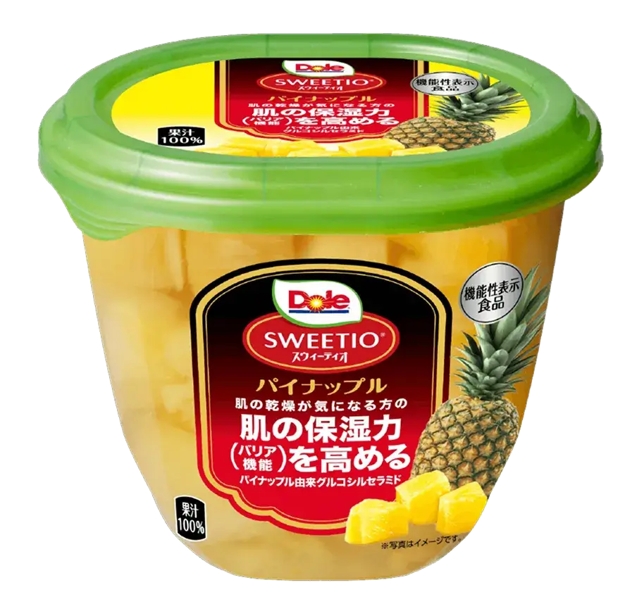 <スウィーティオで美味しく、美しく。※> 「スウィーティオパイナップル」に含まれる「パイナップル由来グルコシルセラミド」には、肌の乾燥が気になる方のバリア機能・保湿力を高める効果が認められ、【機能性表示食品】として届出されました。 1日100gを食べることで、肌の保湿力(バリア機能)を高めることが報告されています。(※パイナップル由来グルコシルセラミドを1.2mg/日、12週間継続摂取することで経表皮水分蒸散量が有意に低下することが分かっています。) ※保湿効果による健康的な肌のこと
