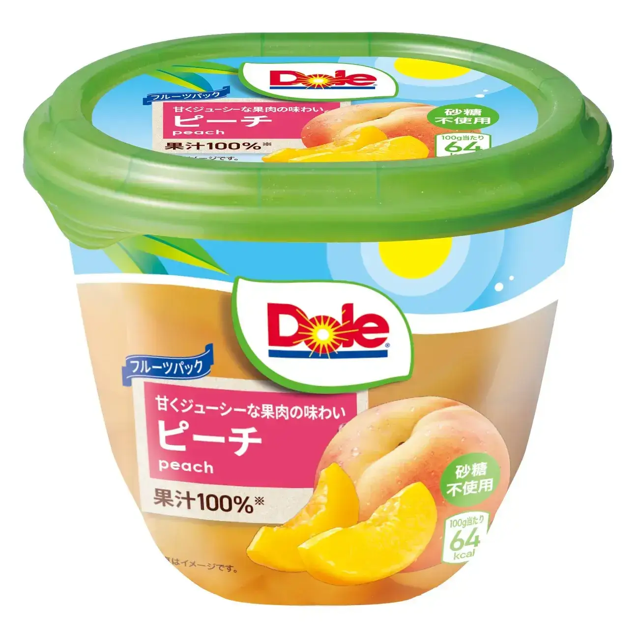 フルーツパック ピーチ 人気のピーチをご家庭向けにたっぷりサイズ、425gでパックしました。 ドールこだわりの黄桃で、ジューシーな食感とつややかな橙色の果肉をお楽しみいただけます。 シロップを使わず、液部に果汁100%を使用。 砂糖不使用で、果物だけのおいしさ。 ※在庫状況によっては旧パッケージでのご案内になる場合がございます。 ご購入の際は、サイトの内容をよくご確認ください。 商品情報 栄養成分表示(100gあたり) 熱量 64kcal たんぱく質 0.4g 脂質 0g 炭水化物 15.3g -糖類 13.3g 食塩相当量 0.03g 保存方法 高温、直射日光を避けて保存して下さい。 詳細情報 内容量 425g 原材料 もも、濃縮果汁(ぶどう、レモン)/酸化防止剤(ビタミンC) 含有アレルギー物質(28品目中) もも